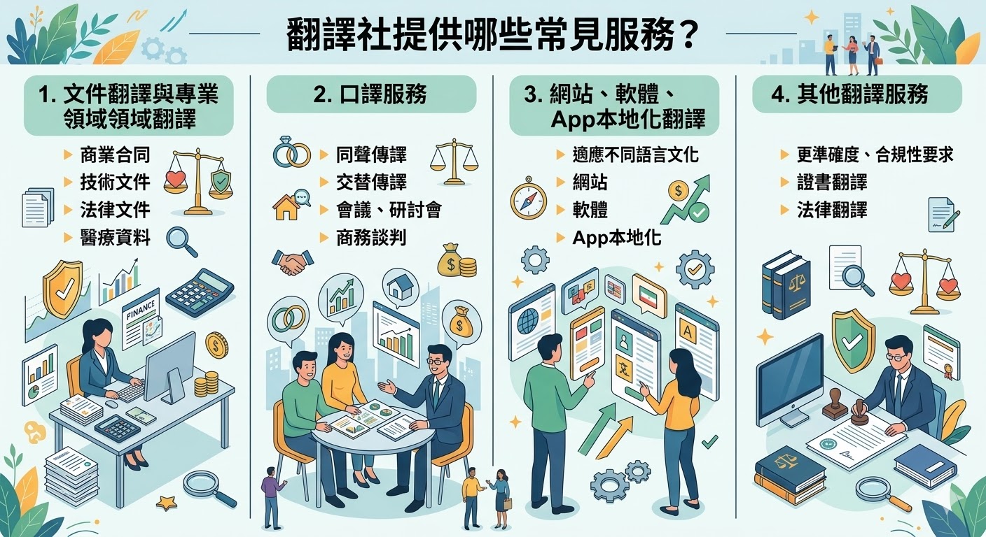 A:翻譯社提供的服務通常包括文件翻譯、口譯服務、網站與App本地化翻譯、證書翻譯與專業領域翻譯等。
